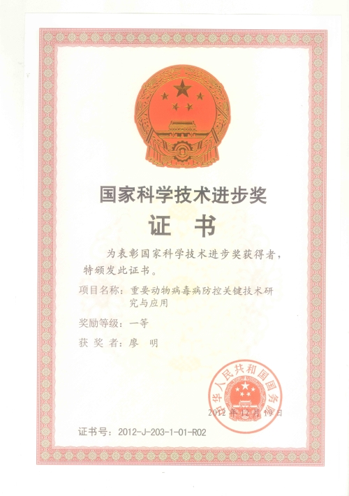 取得的成绩:1、实验室近年来获得奖励近20余项,在7年内两获国家最高奖,其中“H5亚型禽流感灭活疫苗的研制及应用”项目获得2005年度国家科技进步一等奖,“重要动物病毒病防控关键技术研究与应用”项目获得2012年度国家科技进步一等奖。2、实验室自主研发了“禽流感灭活疫苗”(系列产品)、新城疫灭活疫苗、“禽喘灵”、“禽用肾肿药”、“球必清”、“氟苯尼考水溶性粉”等十几项科研成果,并已成功实现技术转让,创造超过百亿元的直接和间接经济效益。其中2013年研究成果取得了“禽流感灭活疫苗(H5N2亚型,D7株)”新兽药证书,该成果为我国第一个水禽专用禽流感疫苗,成为禽流感疫苗研究的一个里程碑。2017年又获得了“禽流感病毒H5亚型灭活疫苗(D7+rD8株)”新兽药证书,该成果的获得将为我国H5亚型高致病性禽流感的防控做出新的贡献。3、实验室近五年发表各类文章500余篇,其中SCI收录高水平文章近200篇。