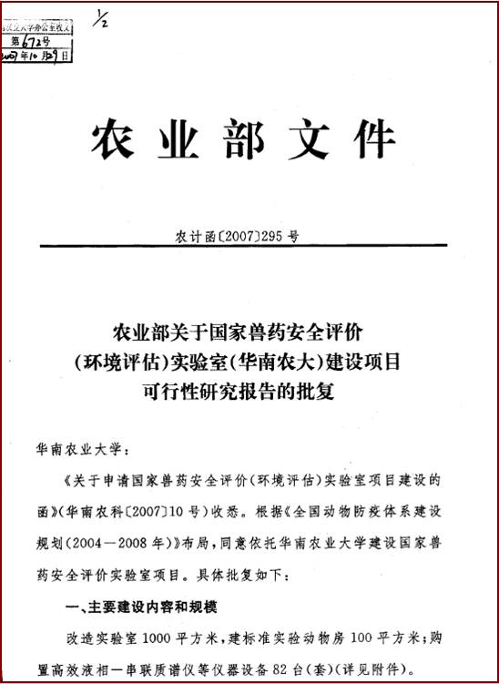 依据发改农经[2006]2837号文件“全国动物防疫体系建设规划(2004-2008)”中有关兽药质量监察及残留监控设施建设要求,2007年10月农业部批准拨款1049万元同意依托beat365中文官方网站建设国家兽药安全评价(环境评估)实验室项目。现已建成实验功能区包括兽药理化性质与残留分析实验室、普通毒理学实验室、水生生物(淡水/海水)与土壤微生物安全评价实验室、土壤人工气候与水生生物模拟区、兽药环境行为实验室、细胞与分子生态毒理实验室以及普通与精密仪器实验室等18间标准实验室共1549.5m2,改建成万级动物实验房和标准水生生物、土壤实验房等共106m2。拥有如高效液相色谱-串联质谱仪(LC-MS/MS)、气相色谱-串联质谱仪(GC-MS/MS)、傅立叶变换红外光谱仪、全自动薄层扫描色谱仪、抗生素效价测定仪、固相萃取系统、微生物鉴定药敏分析系统等共90多台套精密仪器设备。