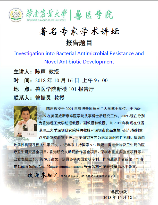 学术讲座(2018.10.16):Investigation into Bacterial Antimicrobial Resistance and Novel Antibiotic Development