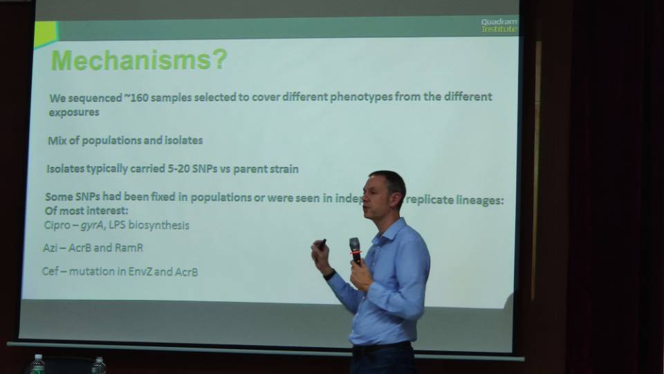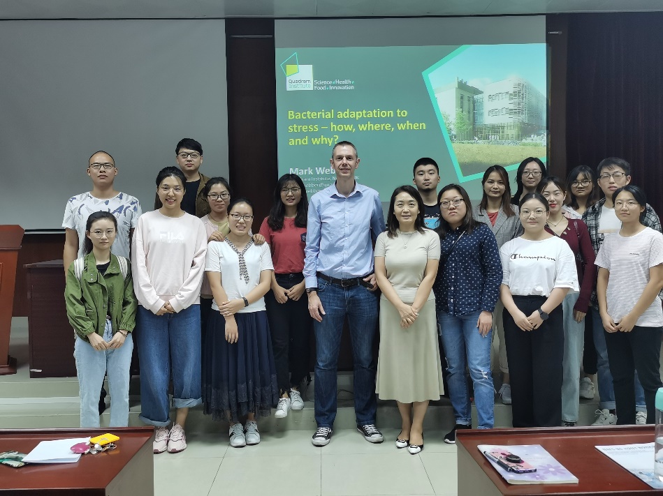 Mark Webber教授先做了一场题为“Studying adaptation of bacteria to stresses in the food chain”的学术报告,Mark Webber教授近年来一直关注细菌耐药性与生物膜的关系,从How, When, Where and Why 几个方面探讨耐药性形成机制和生物膜的演化,最终目标是提出预防和治疗感染的最佳策略。学术报告中Mark Webber教授介绍了他的课题组利用大量的转座突变文库探讨各种胁迫下生物膜的适应性、演化并发现了新的耐药机制,并且构建了基于这种大量的转座突变文库的灵活高效研究平台进行微生物学和微生物组研究。接着Mark Webber教授还做了一个题为“Introduction about different channels for Chinese researchers to apply for UK-China cooperation program”的简短报告。Mark Webber教授的学术报告内容丰富、研究方法新颖,引起了大家的极大兴趣;另外他还从中英合作的角度耐心讲解了英国不同基金项目的特点和申报难易程度,报告内容非常实用。