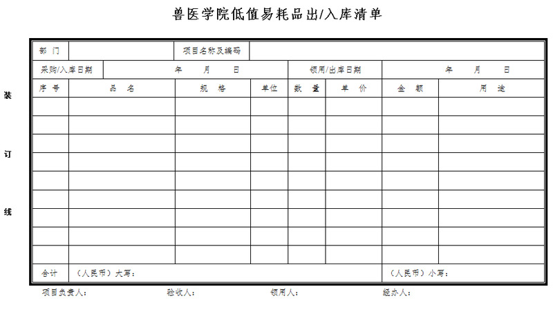 各项目负责人必须指定物管员负责低值易耗品的领用和保管工作,并进行出入库登记。对于批量购进的低值易耗品,要做到先入库后领用;对于零星购进的低值易耗品,须先交由物管员验收登记后,方能领用或借用。领用物品要办理审批和登记手续,及时填写《我院低值易耗品出/入库清单》。