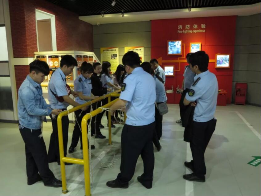 北京朝阳公共安全馆,公职人员组织学习应急逃生绳结方法。