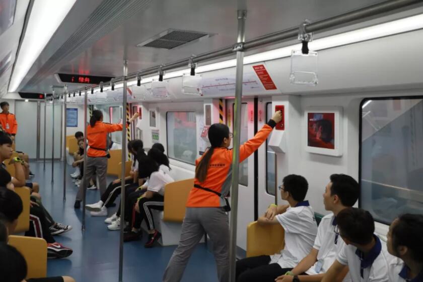 在上海市公共安全教育实训基地,学生们正在学习地铁应急逃生知识。