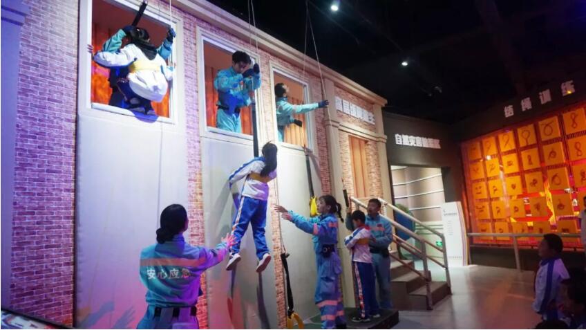 青岛西海岸新区应急安全体验教育基地,青少年体验高楼逃生缓降器使用。