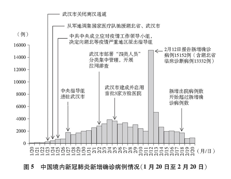 全国新增确诊病例快速增加,防控形势异常严峻。中国采取阻断病毒传播的关键一招,坚决果断关闭离汉离鄂通道,武汉保卫战、湖北保卫战全面打响。中共中央成立应对疫情工作领导小组,并向湖北等疫情严重地区派出中央指导组。国务院先后建立联防联控机制、复工复产推进工作机制。全国集中资源和力量驰援湖北省和武汉市。各地启动重大突发公共卫生事件应急响应。最全面最严格最彻底的全国疫情防控正式展开,疫情蔓延势头初步遏制。(图5)