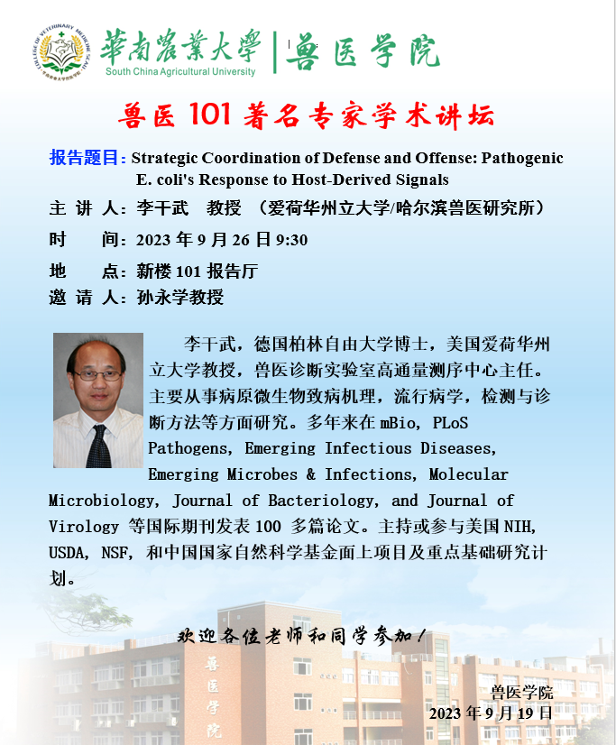 学术论坛(2023.09.26)Strategic Coordination of Defense and Offense: Pathogenic E. coli's Response to Host-Derived Signals